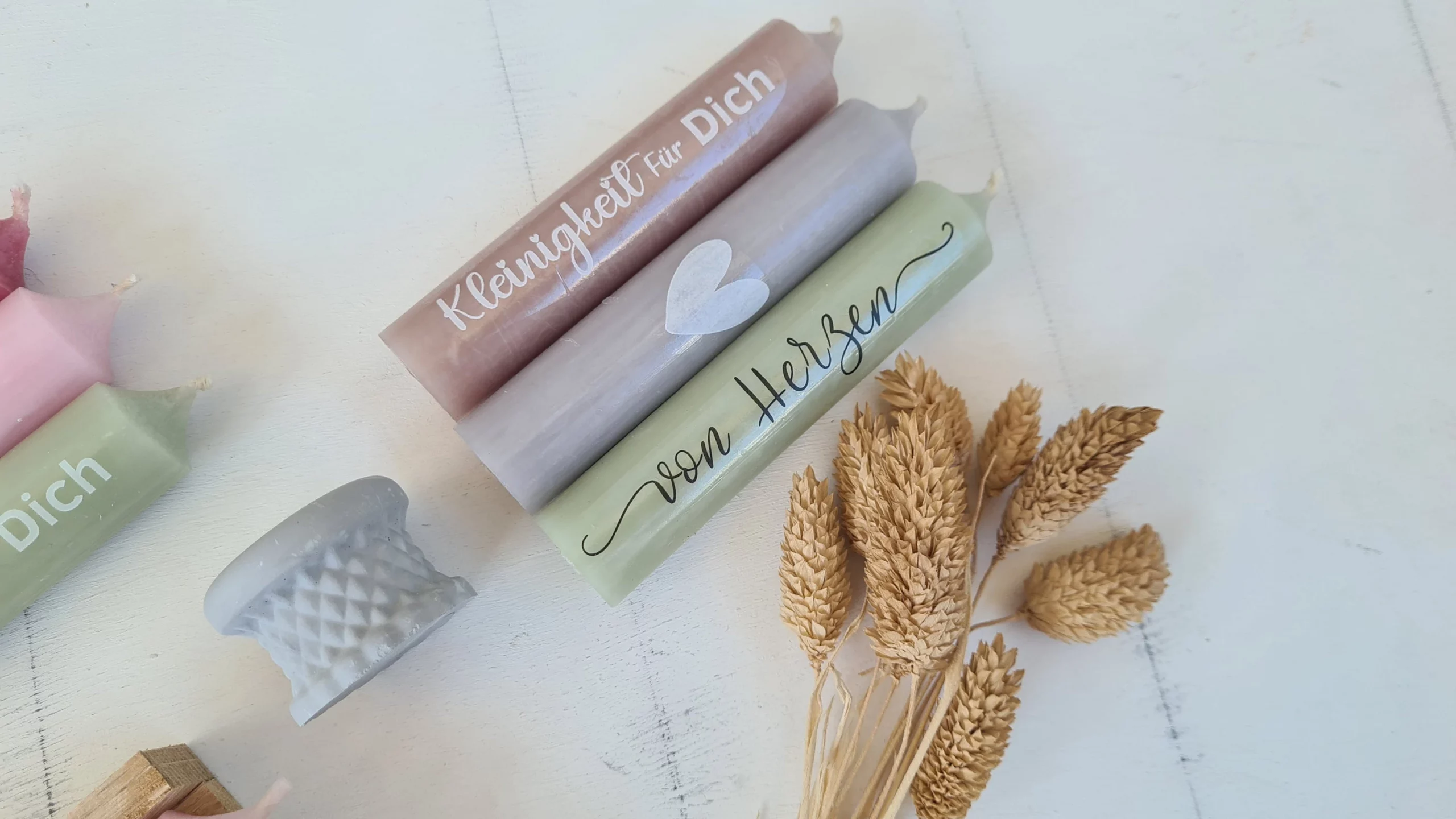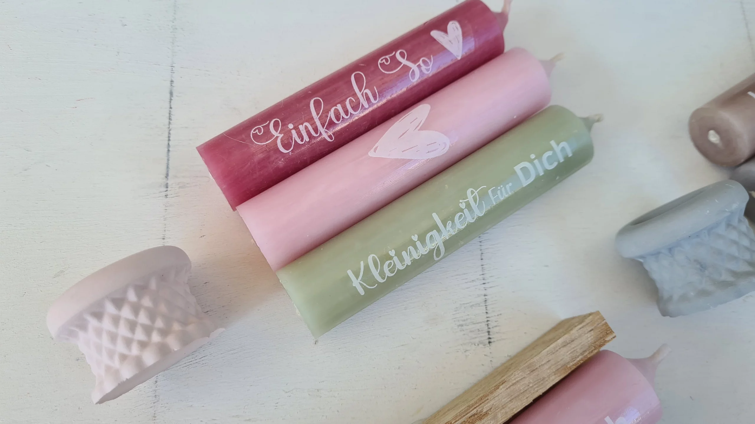 Die Kerzenhalter sind aus Raysin gegossen und erhältlich in den Farben weiß, grau und altrosa.