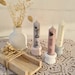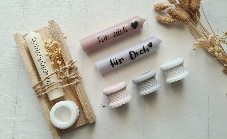 Zusätzlich dazu beinhaltet das Set noch eine Stabkerze. Das alles schön verpackt in einer Holbox und mit Trockenblumen dekoriert.