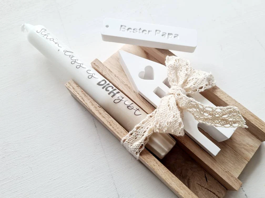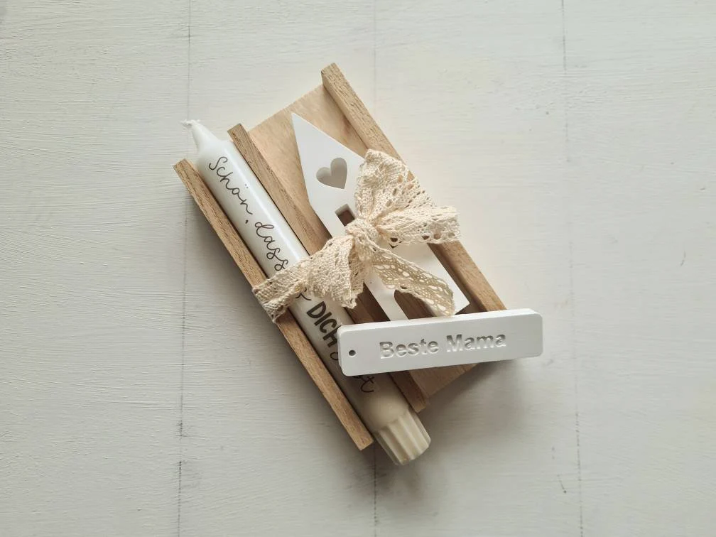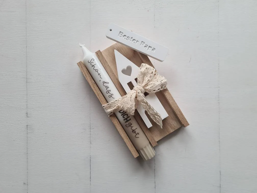 Das besondere „Etwas“ gibt diesem Set die Holzaufbewahrung, in die die Kerze und das Häuschen gelegt und verpackt sind.
