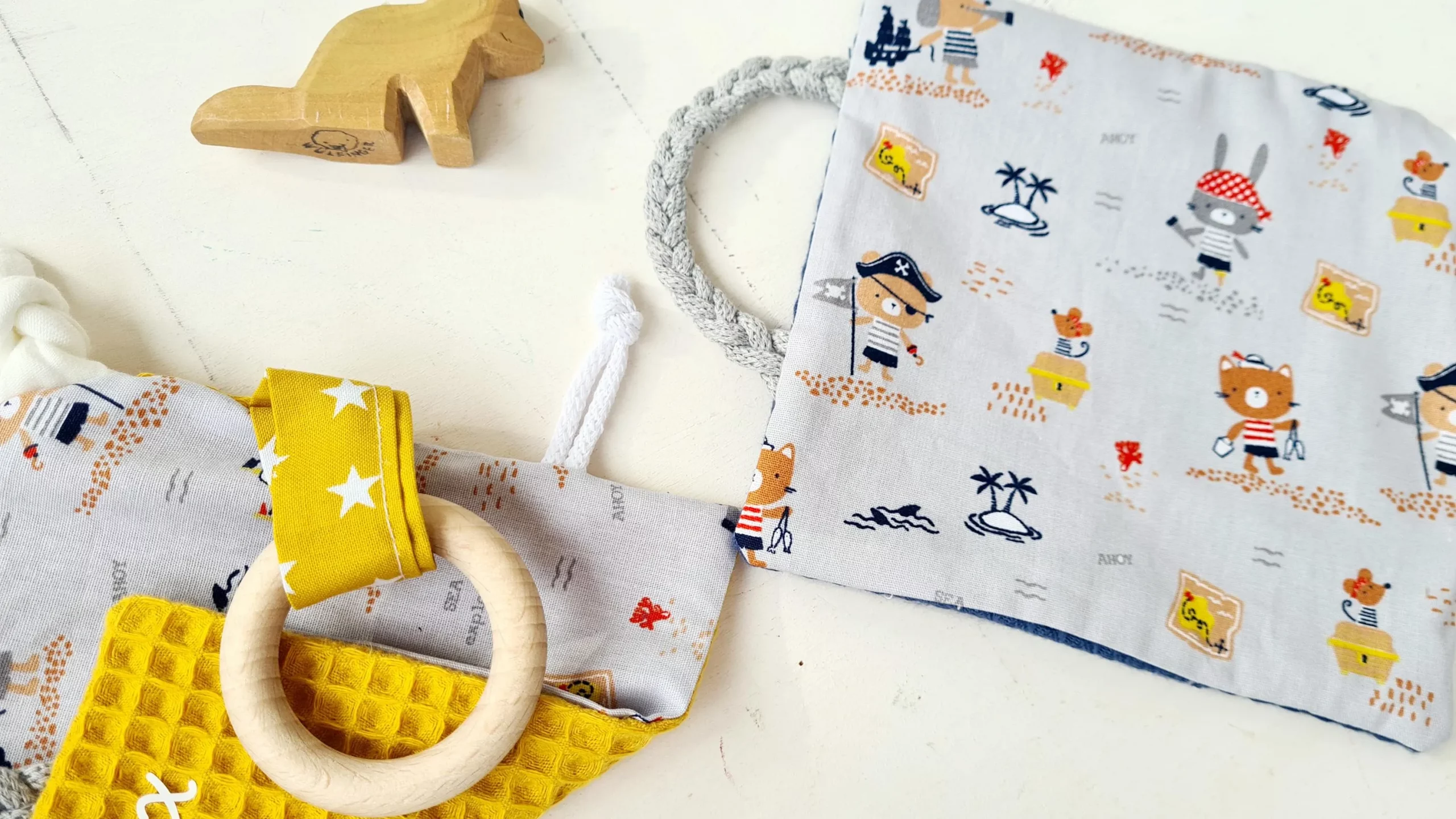 Um deinem Baby viel Entdeckungsmöglichkeiten zu bieten, sind an die Seiten Stofflaschen fest eingenäht. Auch die Folie ist keine gewöhnliche. Sie raschelt besonders laut und ist Hitzebeständig. Der Greifling ist aus unbehandeltem Buchenholz frei von Chemikalien und ist groß genug um nicht verschluckt zu werden.
