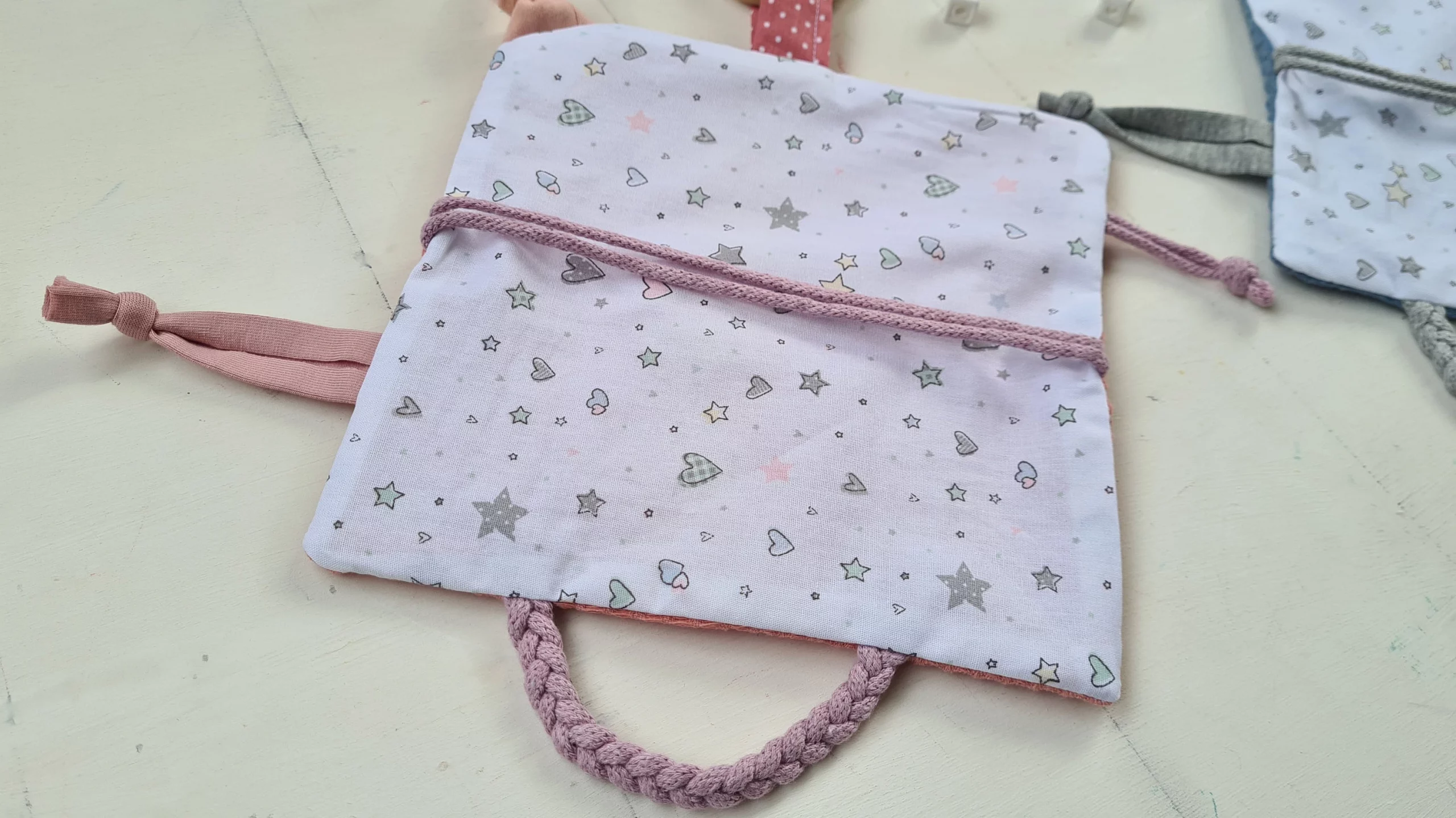 Materialien: Baumwollkordel, Baumwollstoff, Holzring, Waffelpique Baumwoll, Webbänder, Baumwolle, Knisterfoli