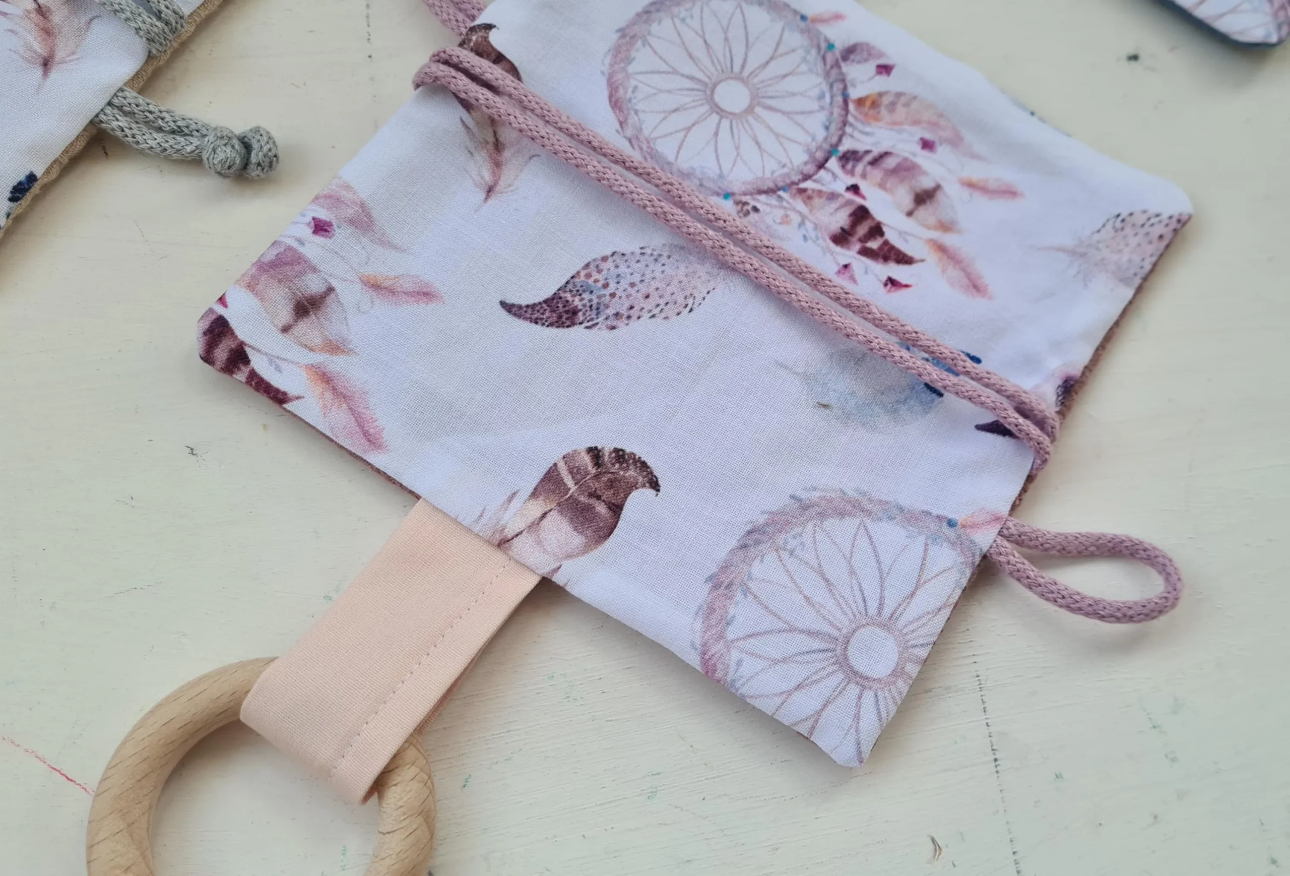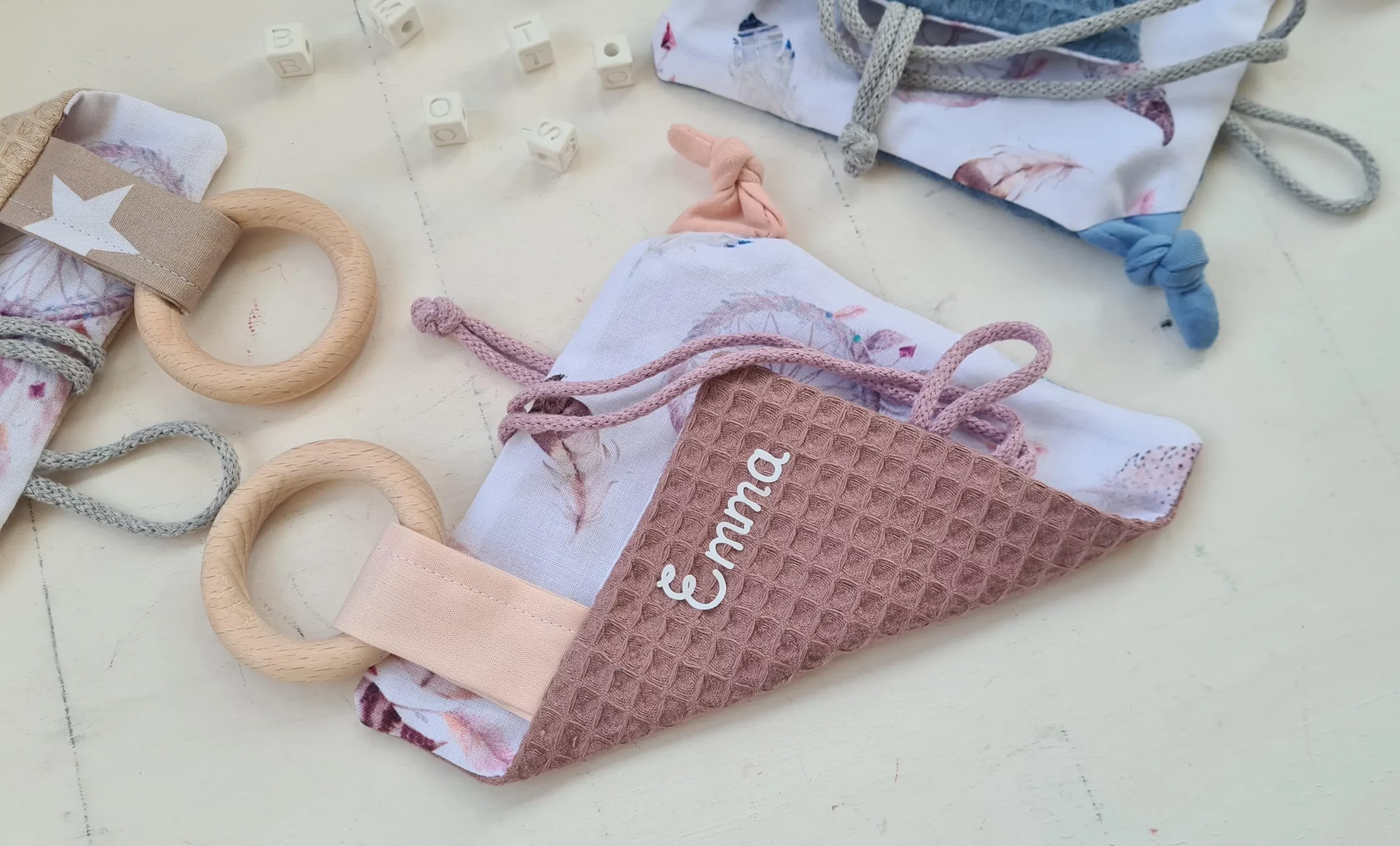 Um deinem Baby viel Entdeckungsmöglichkeiten zu bieten, sind an die Seiten Stofflaschen fest eingenäht. Auch die Folie ist keine gewöhnliche. Sie raschelt besonders laut und ist Hitzebeständig. Der Greifling ist aus unbehandeltem Buchenholz frei von Chemikalien und ist groß genug um nicht verschluckt zu werden.