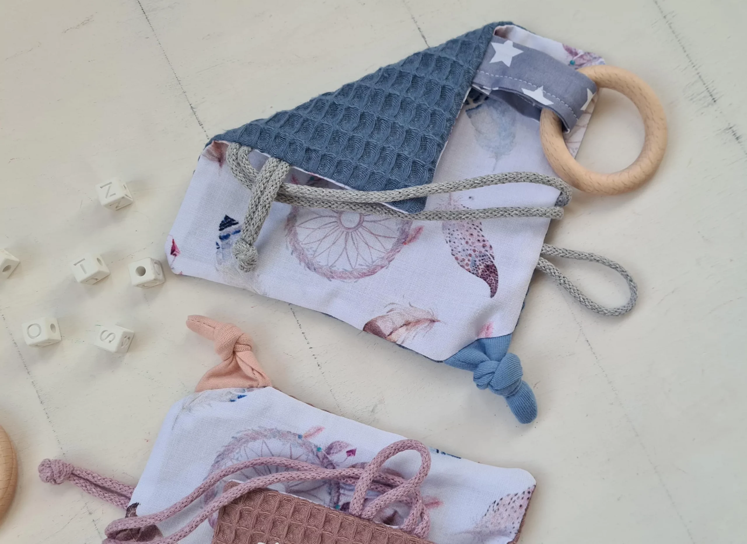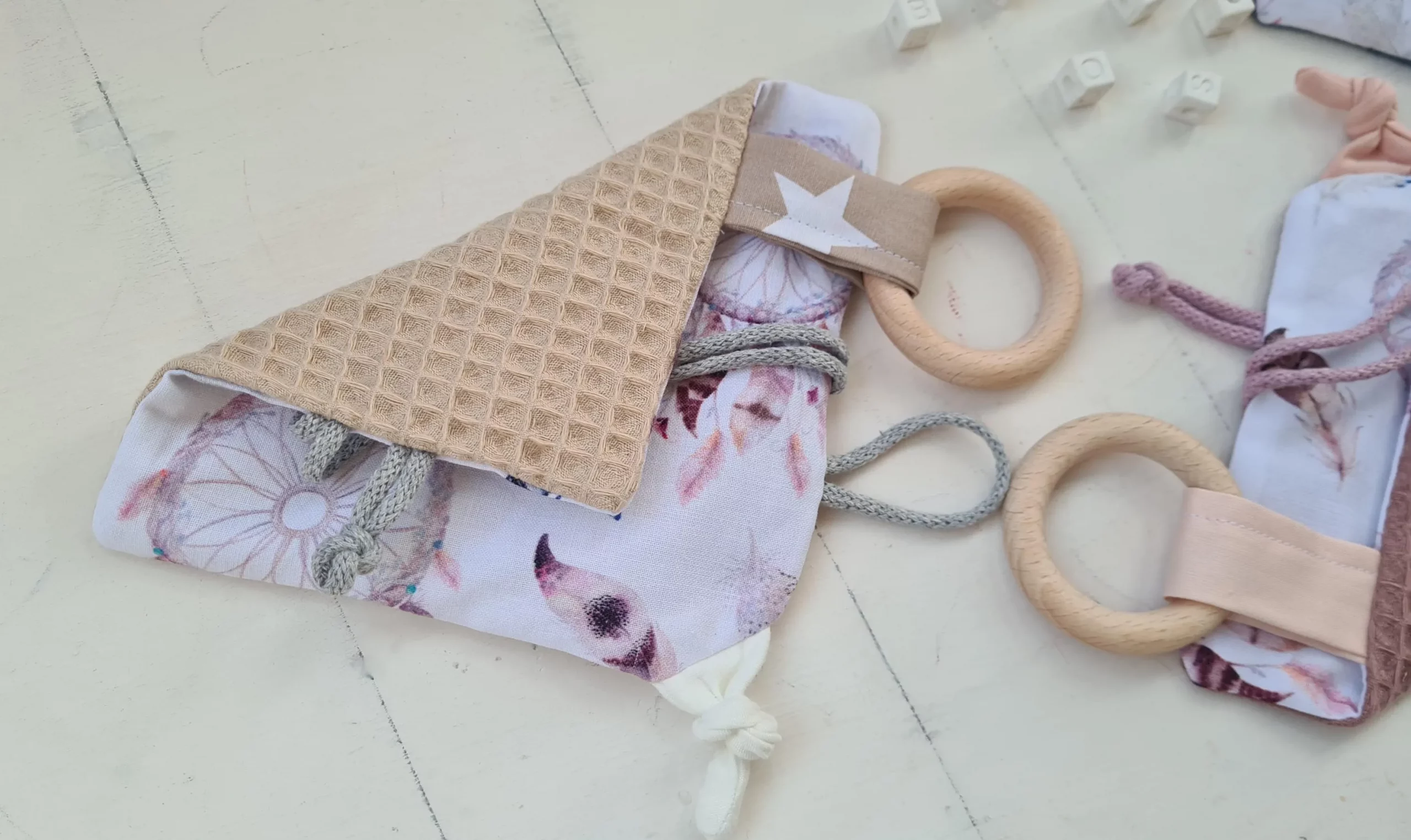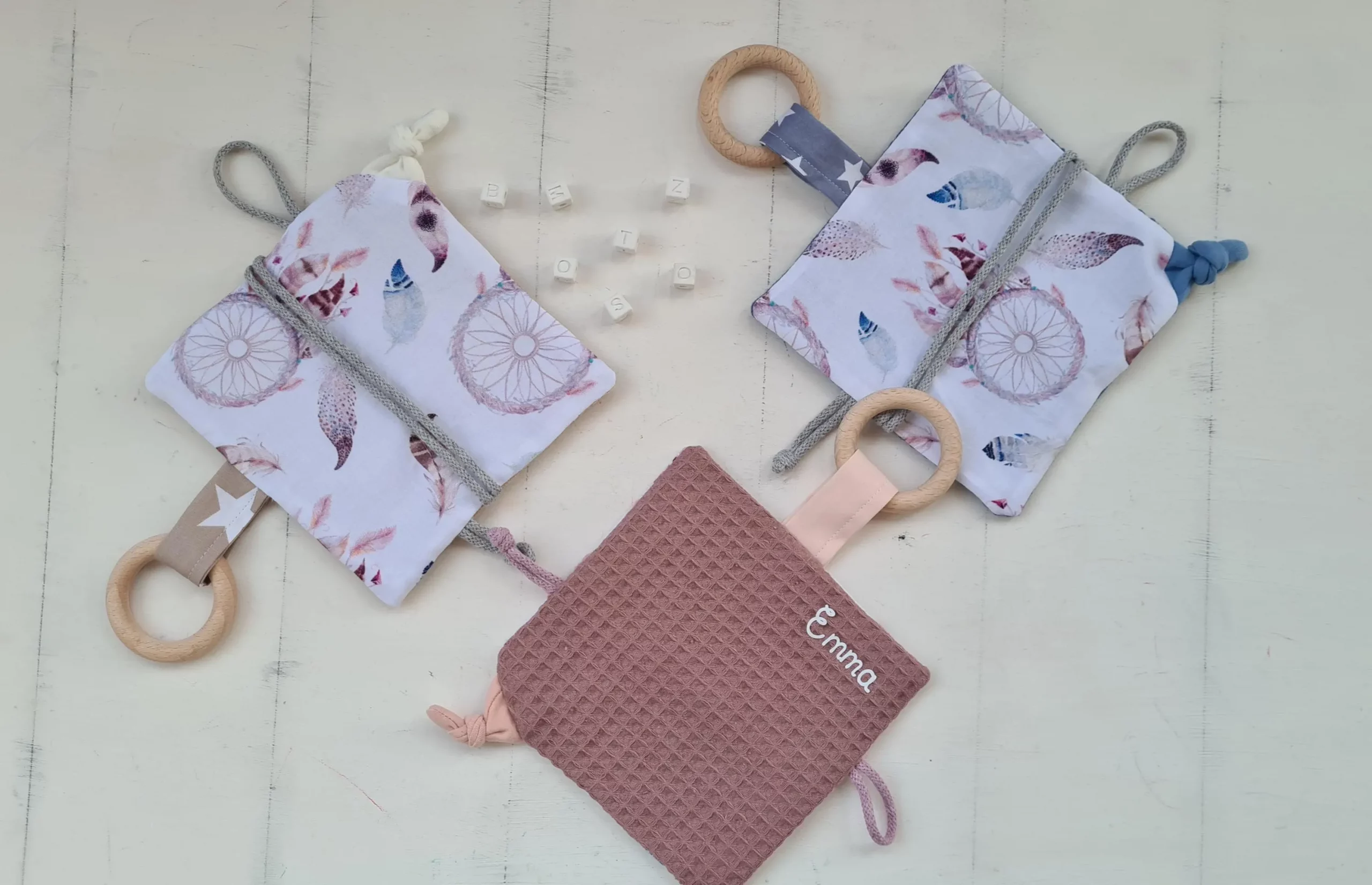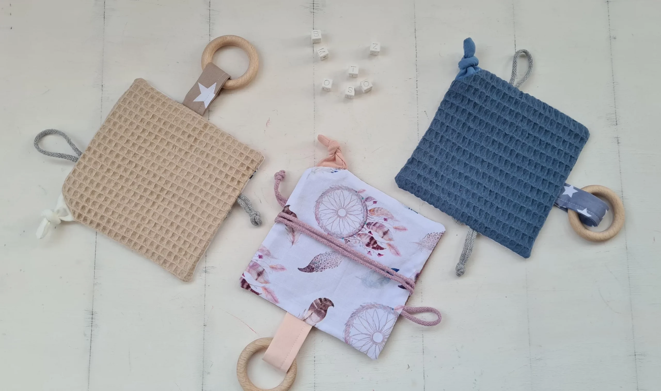 Hinweis: Das Spielen mit Knistertüchern sollte immer unter Aufsicht geschehen! Die Bändchen sind zwar doppelt eingenäht, jedoch übernehme keinerlei Haftung, sollte sich doch mal ein Bändchen lösen.