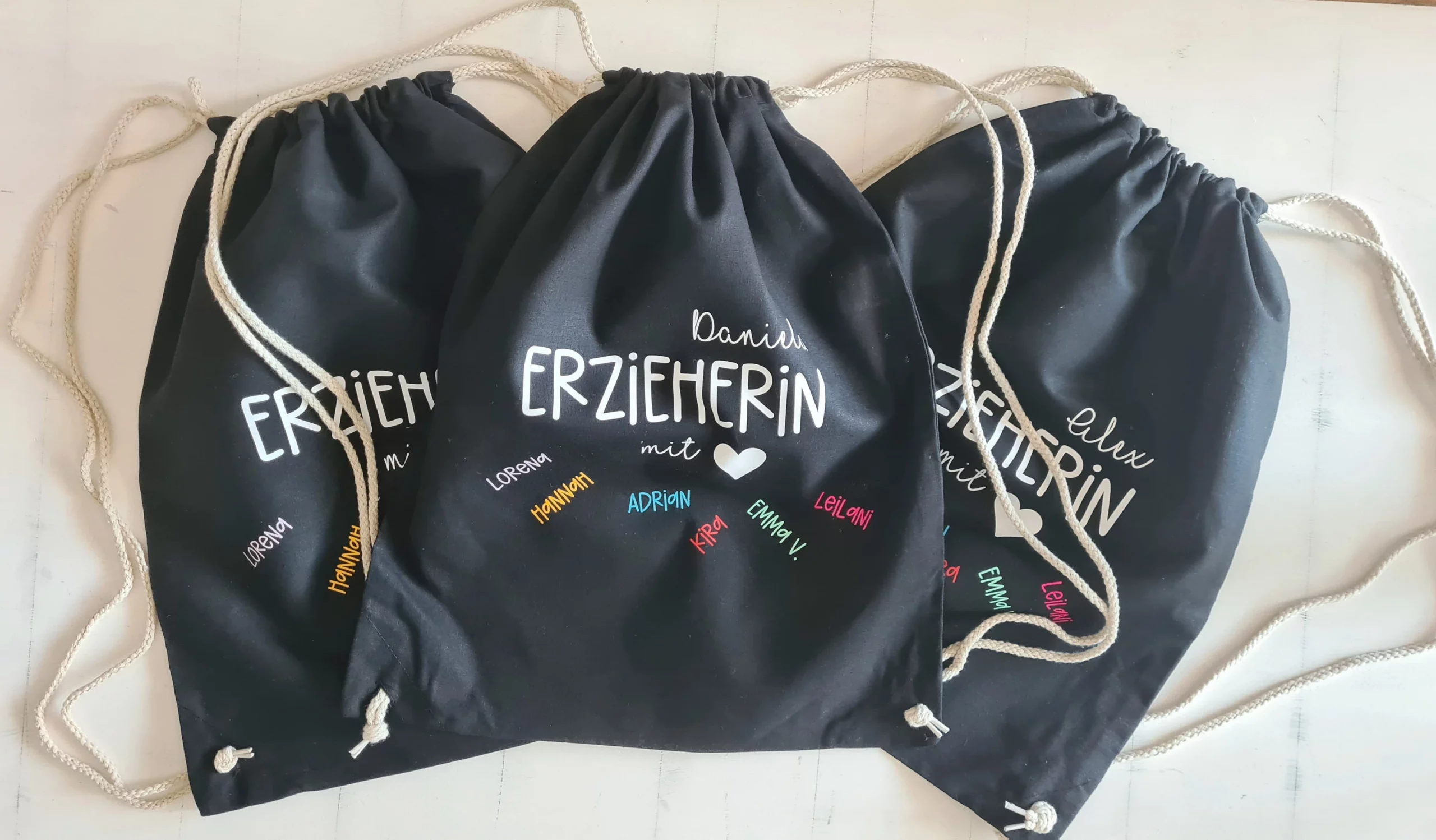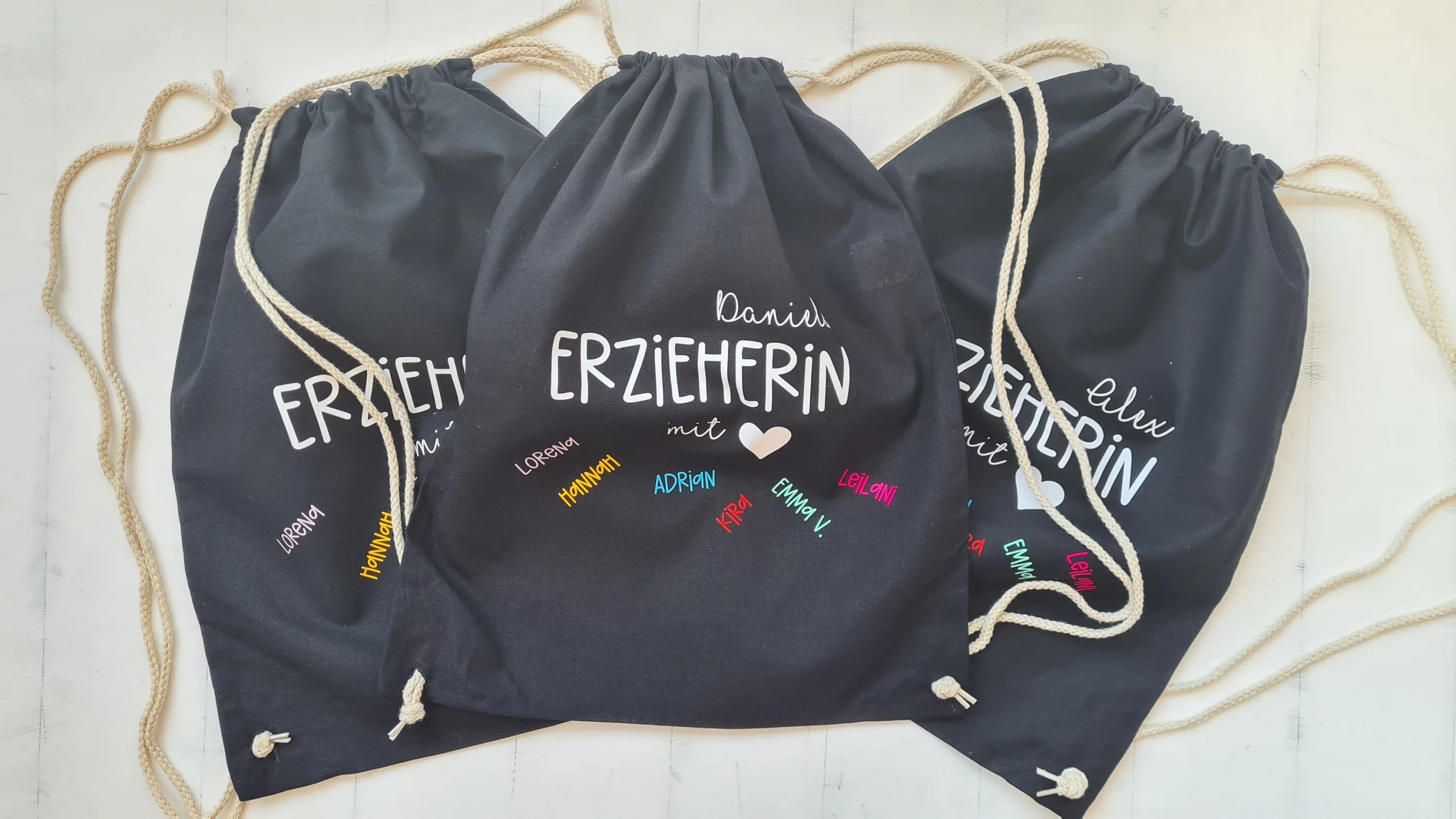 Der Turnbeutel wird jeweils mit dem Namen der Erzieherin und deren Kindergartenkinder in bunter Farbmischung personalisiert.