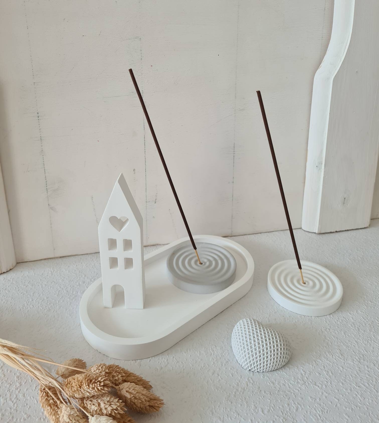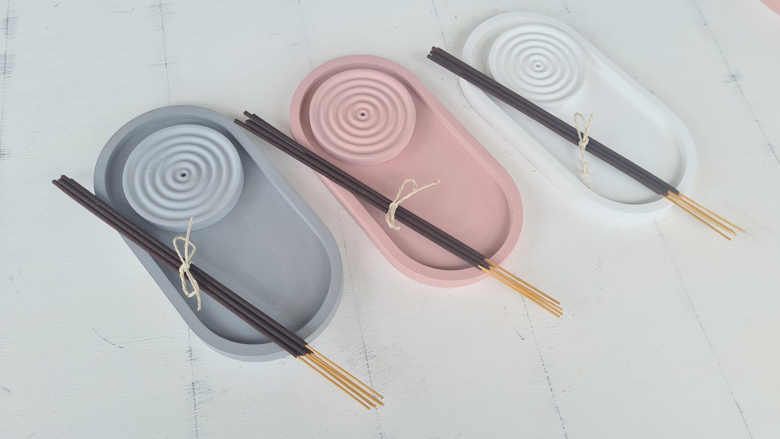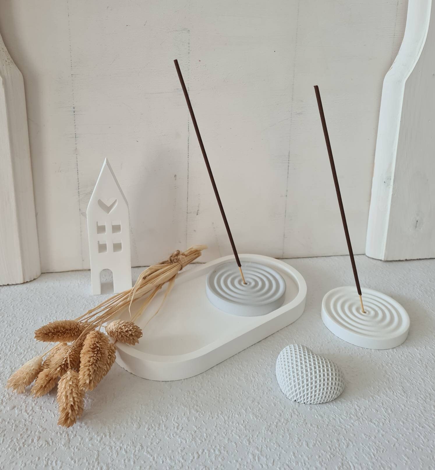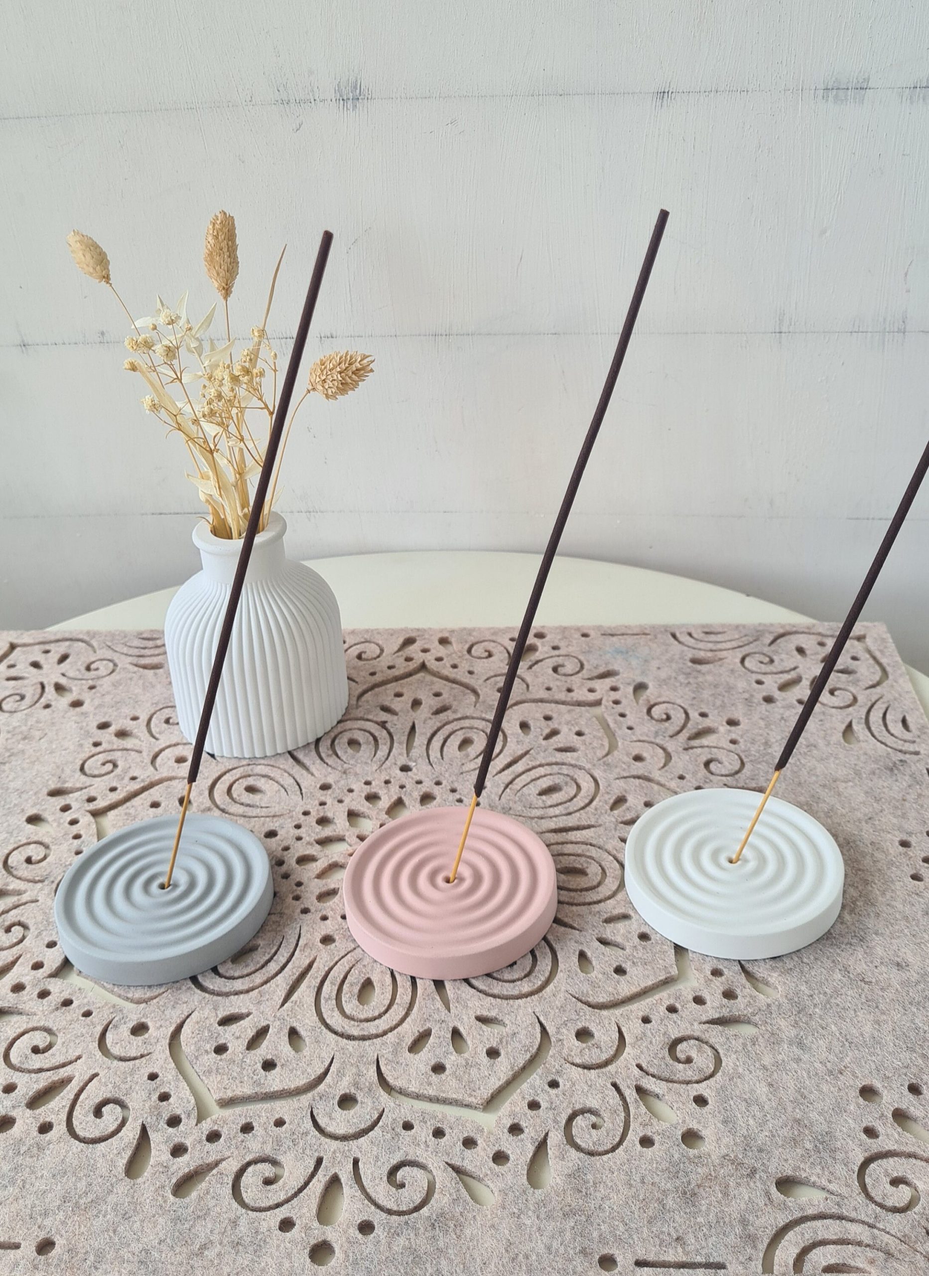 Die Räucherstäbchenhalter sind aus Raysin gegossen und in der Farbe weiß, altrosa oder grau erhältlich. Falls du die Farbkombi ändern möchtest, dann schreib mich gerne an.