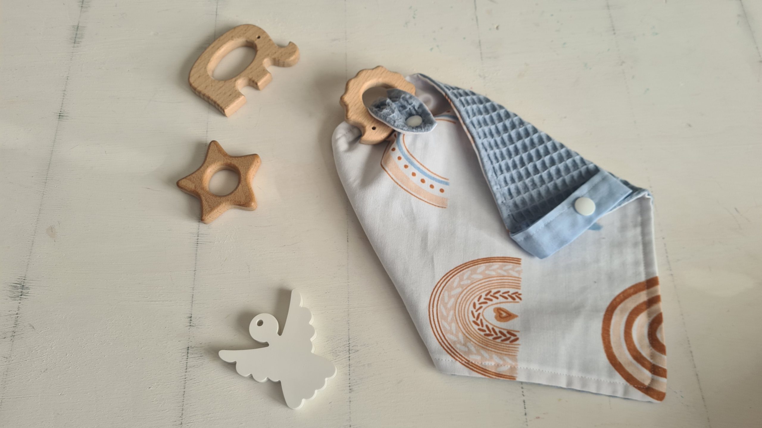 Praktisch ist auch die eingenähte Schnullerlasche die mit einem Druckknopf verschlossen werden kann.