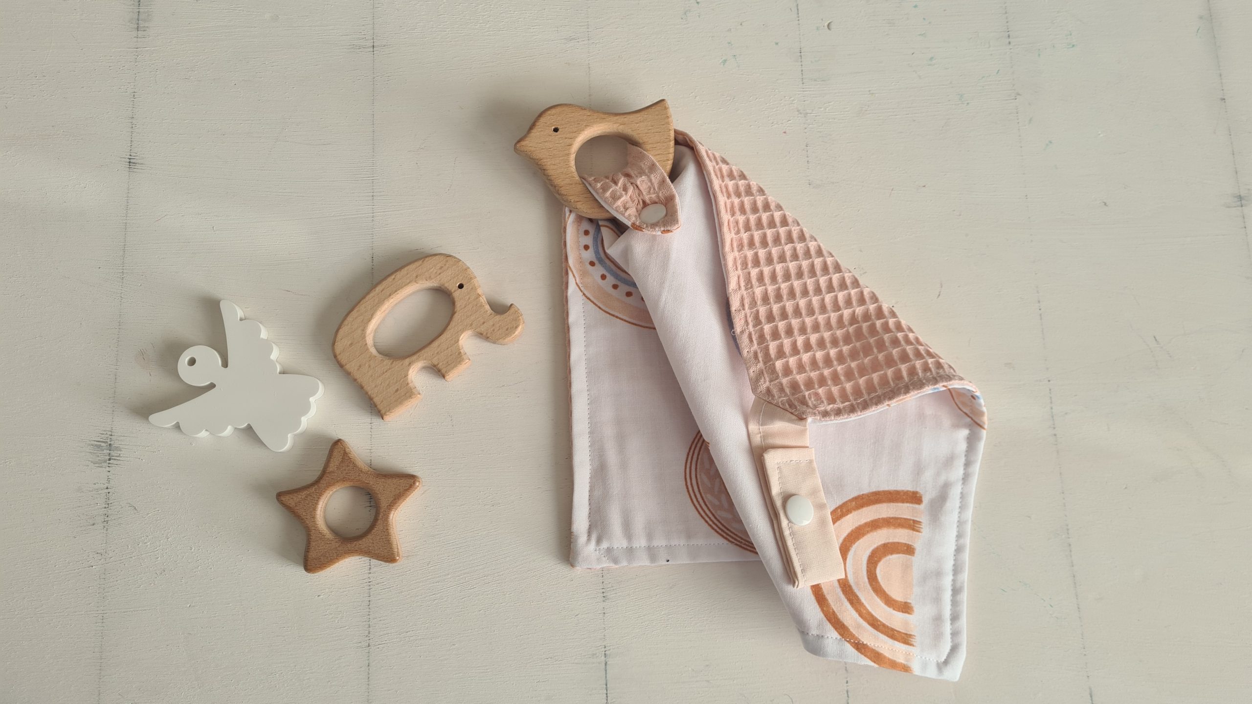 Holzgreifling kann durch das Öffnen des Druckknopfes entfernt werden, so kann das Tuch schnell und einfach in der Waschmaschine gewaschen werden.